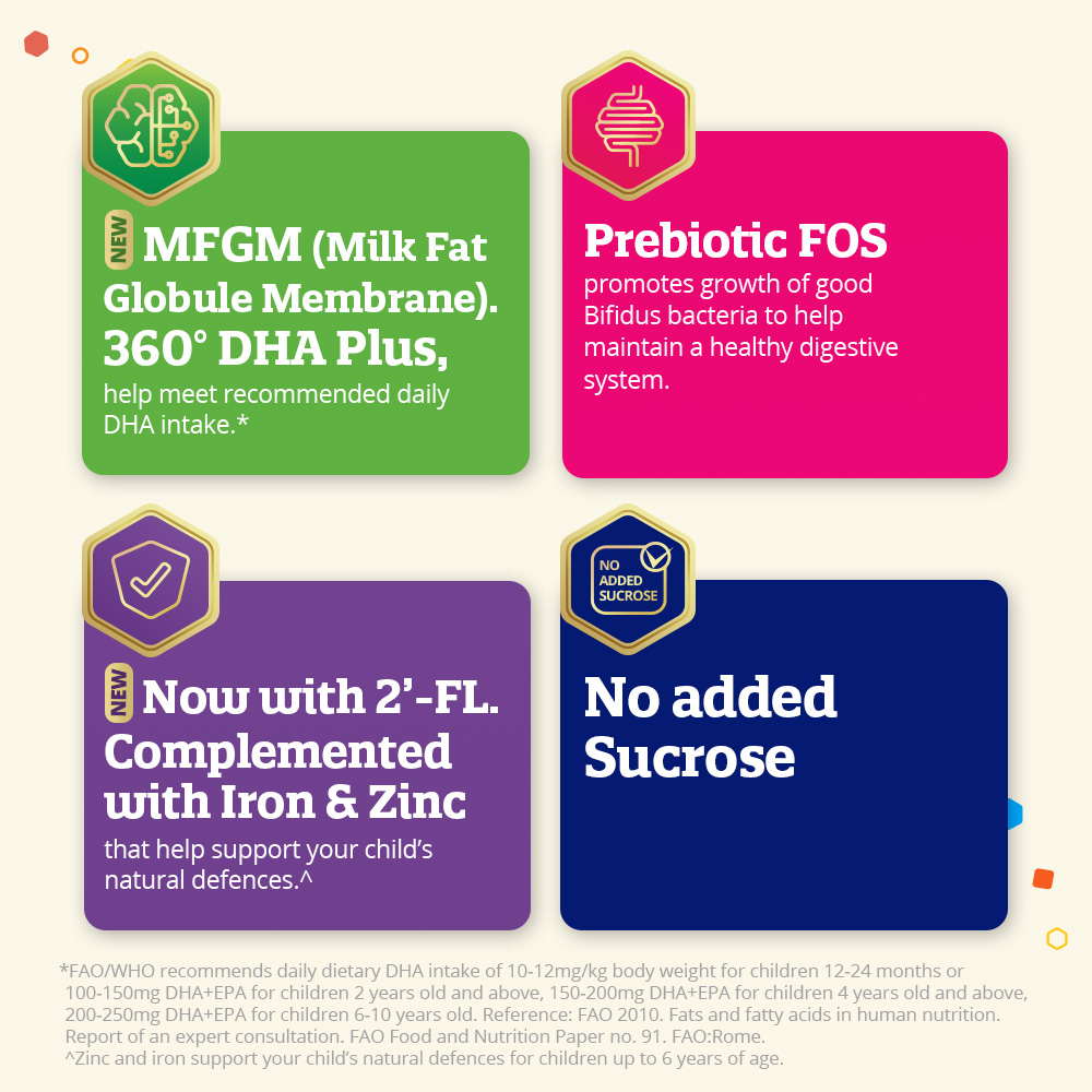 Milk Fat Globule Membrane (MFGM) is a natural source of phospholipids and spingomyelin, derived from whey protein Formulated with 360’ DHA Plus to help meet recommended daily DHA intake*.