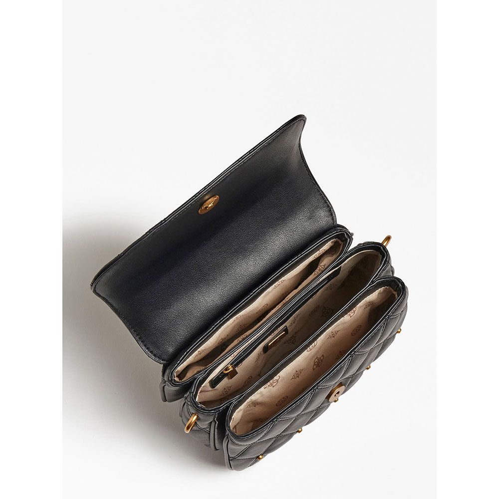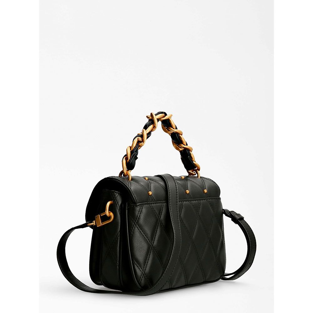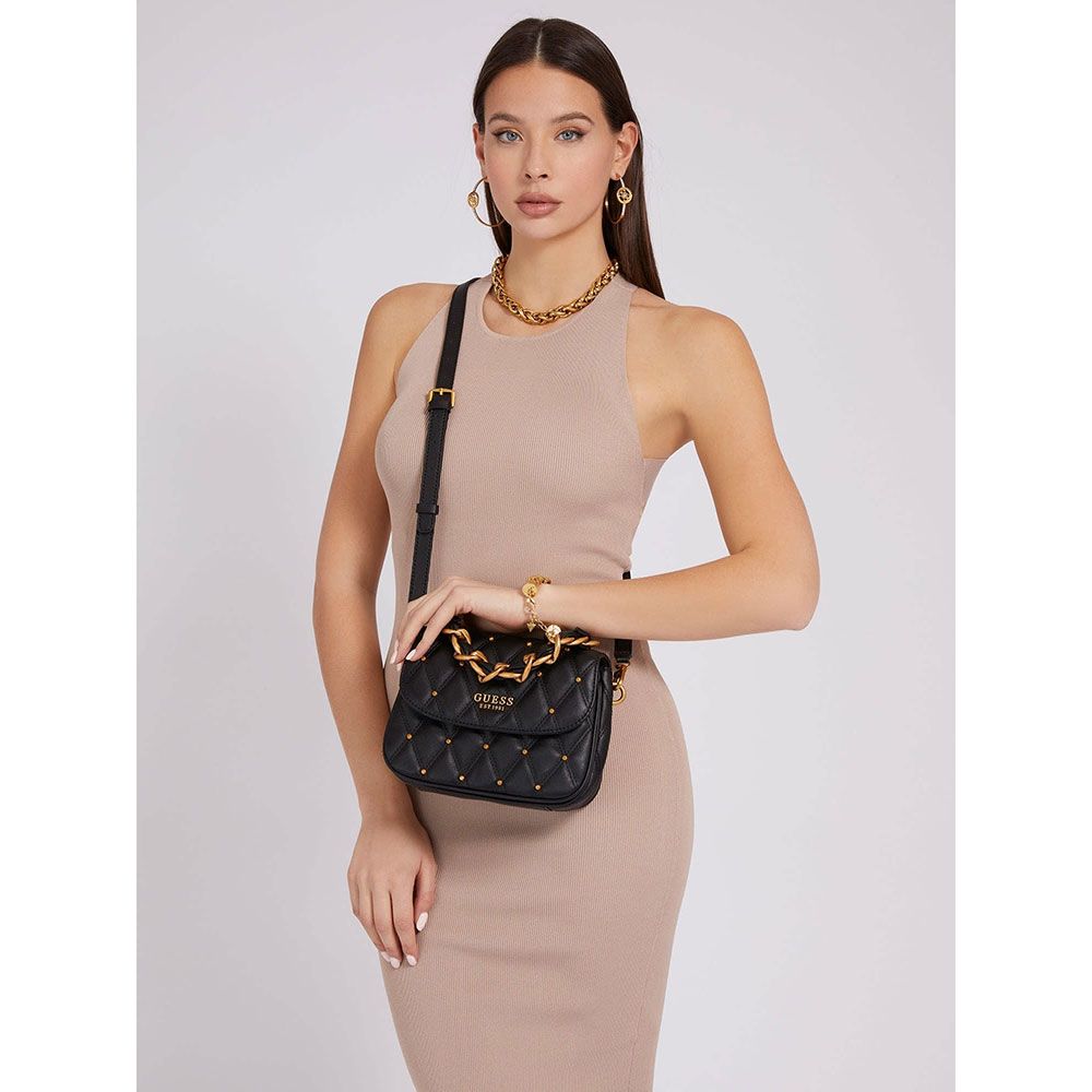Elegant Quilt designed handbag . Top handle. Multiple compartments. Guess name Logo. Comes with charms and embelishments to make it look extremely attractive.